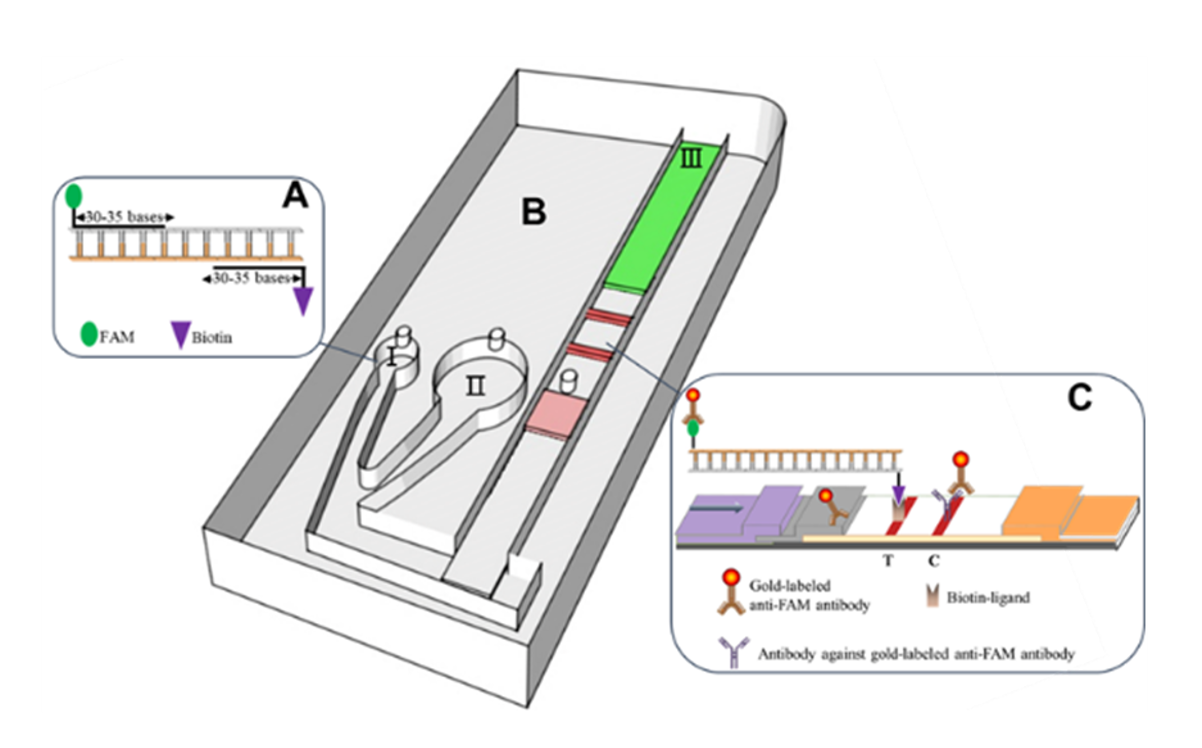 The COVID-19 pandemic, caused by SARS-CoV-2, currently poses an urgent global medical crisis for which there remains a lack of affordable point-of-care testing (POCT). In particular, resource-limited areas need simple and easily disseminated testing solutions to manage the outbreak. In this work, a microfluidic-integrated lateral flow recombinase polymerase amplification (MI-IF-RPA) assay was developed for rapid and sensitive detection of SARS-CoV-2, which integrates the reverse transcription recombinase polymerase amplification (RT-RPA) and a universal lateral flow (LF) dipstick detection system into a single microfluidic chip. The single-chamber RT-RPA reaction components are mixed with running buffer, and then delivered to the LF detection strips for biotin- and FAM-labelled amplified analyte sequences, which can provide easily interpreted positive or negative results. Testing requires only a simple nucleic acid extraction and loading, then incubation to obtain results, approximately 30 minutes in total. SARS-CoV-2 armored RNA particles were used to validate the MI-IF-RPA system, which showed a limit of detection of 1 copy/μL, or 30 copies per sample. Chip performance was further evaluated using clinically diagnosed cases of COVID-19 and revealed a sensitivity of 97% and specificity of 100%, highly comparable to current reverse transcription-polymerase chain reaction (RT-PCR)-based diagnostic assays. This MI-IF-RPA assay is portable and comprised of affordable materials, enabling mass production and decreased risk of contamination. Without need for specialized instrumentation and training, MI-IF-RPA assay can be used as a complement to RT-PCR for low-cost COVID-19 screening in resource-limited areas.