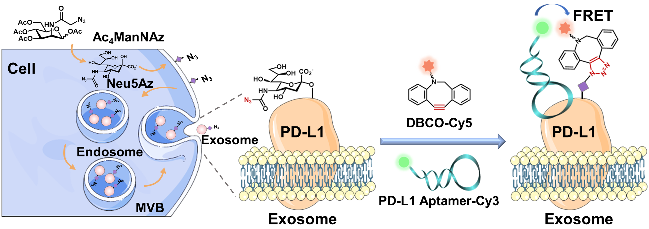 Exosomal glycoproteins play important roles in many physiological and pathological functions. However, the existing methods for studying glycosylation of exosomal proteins of interest are often cumbersome and affect the exosome integrity. Herein, we developed a dual labeling strategy based on a protein-specific aptamer tagging and metabolic glycan labeling for visualizing glycosylation of specific proteins on exosomes. The glycosylation of exosomal PD-L1 (exoPD-L1) was imaged in situ using intramolecular fluorescence resonance energy transfer (FRET) between fluorescent PD-L1 aptamers bound on exoPD-L1 and fluorescent tags on glycans introduced via metabolic glycan labeling. This method enables in situ visualization and biological function study of exosomal protein glycosylation. Through this strategy, exoPD-L1 glycosylation was confirmed for the first time to be required in interaction with PD-1 and participated in inhibiting of CD8+ T cell proliferation. In general, we have developed an efficient and non-destructive method to study the presence and function of exosomal protein-specific glycosylation in situ, which provides a powerful tool for exosomal glycoproteomics research.