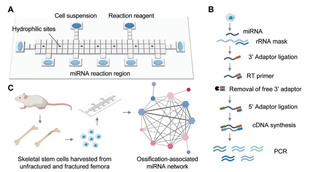 Single-cell microRNA (miRNA) sequencing has allowed for comprehensively studying the abundance and complex networks of miRNAs, which provides insights beyond single-cell heterogeneity into the dynamic regulation of cellular events. Current benchtop-based technologies for single-cell miRNA sequencing are low throughput, limited reaction efficiency, tedious manual operations, and high reagent costs. Here, a highly multiplexed, efficient, integrated, and automated sample preparation platform is introduced for single-cell miRNA sequencing based on digital microfluidics (DMF), named Hiper-seq. The platform integrates major steps and automates the iterative operations of miRNA sequencing library construction by digital control of addressable droplets on the DMF chip. Based on the design of hydrophilic micro-structures and the capability of handling droplets of DMF, multiple single cells can be selectively isolated and subject to sample processing in a highly parallel way, thus increasing the throughput and efficiency for single-cell miRNA measurement. The nanoliter reaction volume of this platform enables a much higher miRNA detection ability and lower reagent cost compared to benchtop methods. It is further applied Hiper-seq to explore miRNAs involved in the ossification of mouse skeletal stem cells after bone fracture and discovered unreported miRNAs that regulate bone repairing.