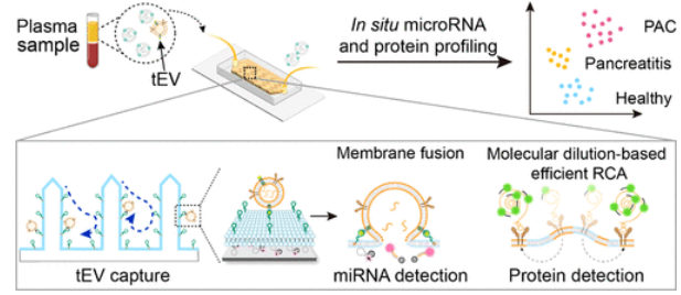 Co-profiling of microRNAs (miRNAs) and membrane proteins of tumor-derived extracellular vesicles (tEVs) is crucial for accurate tumor diagnosis. However, it is hindered by the low abundance of tEVs and the challenge of simultaneous signal transformation from internal and surface markers due to the membrane barrier. Here, we engineered a fluid nanoforest interface (FluidforestFace) within a microfluidic chip by coating supported lipid bilayers (SLBs) on nanoforest substrates, enabling the efficient capture of tEVs and in situ profiling of tEV miRNAs and surface proteins. FluidforestFace offered a large surface area and generated nanovortices with localized low velocities, facilitating the efficient capture of tEVs (∼86.8%). Upon membrane fusion, tEV miRNAs diffused into probe-encapsulated substrates for in situ detection. Meanwhile, tEV membrane proteins were diluted onto SLBs to avoid molecular crowding, which allowed efficient signal amplification reactions for sensitive protein detection using a readily accessible wide-field fluorescence microscope. By codetecting three important miRNA and membrane protein markers, FluidforestFace achieved high diagnostic accuracy for pancreatic cancer patients (n = 38) compared to healthy individuals (n = 12, ∼98.9%) and pancreatitis patients (n = 13, ∼92.9%), indicating its potential for clinical applications.