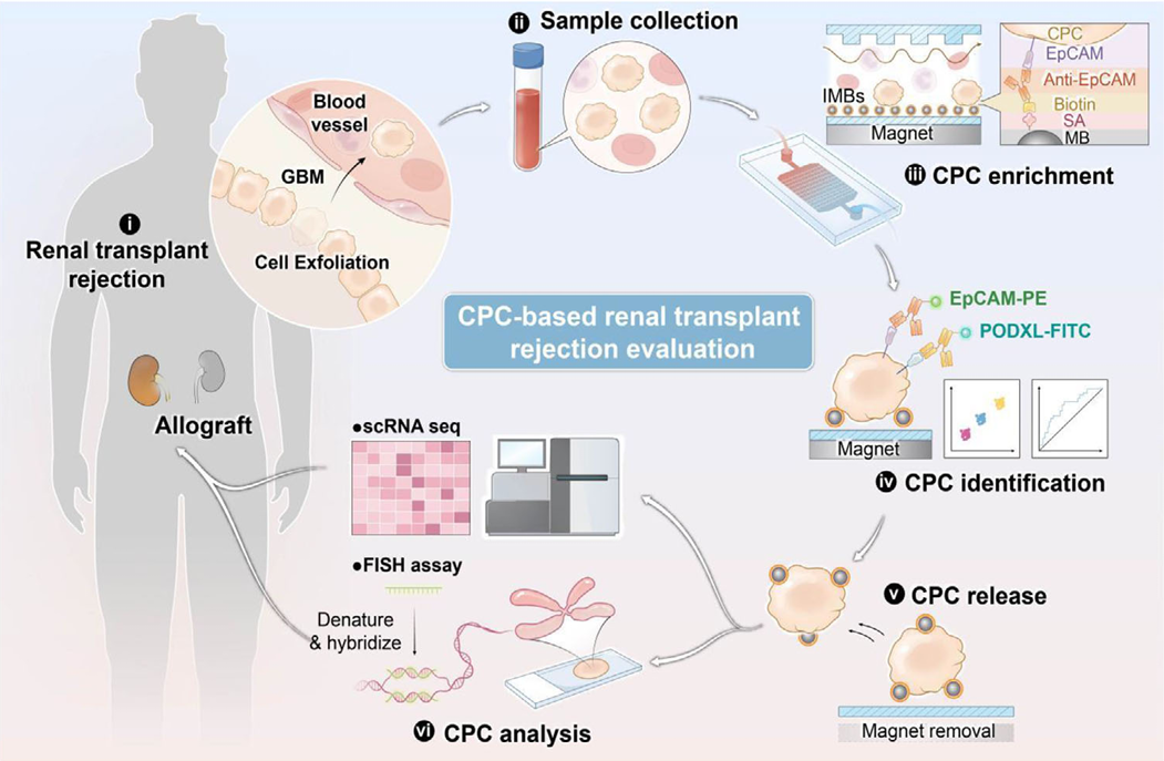 Immune rejection limits long-term renal allograft survival, yet current diagnostics lack non-invasive, and precise detection. Here, donor-derived circulating podocytes (CPCs) are identified as a blood-based surrogate of acute rejection. A magnetically reversible herringbone microfluidic chip equipped with epithelial cell adhesion molecule (EpCAM) antibody-functionalized magnetic beads efficiently isolates CPCs from 1 mL of peripheral blood (capture efficiency 84.4%, release 95.5%, viability 96.0%). Among 65 participants, only transplant recipients with biopsy-confirmed rejection exhibited≥35 CPCs mL- 1 (AUC = 1.0). Fluorescence in situ hybridization (FISH) of sex-mismatched transplants confirmed donor origin. Single-cell RNA-seq of 10 isolated CPCs revealed up-regulation of podocyte-injury and innate/adaptive immune genes (such as NF-κB, TNF, NOD-like receptor pathways) in rejection versus stable samples. CPC enumeration thus provides a minimally invasive, mechanistically informed warning of renal allograft rejection.